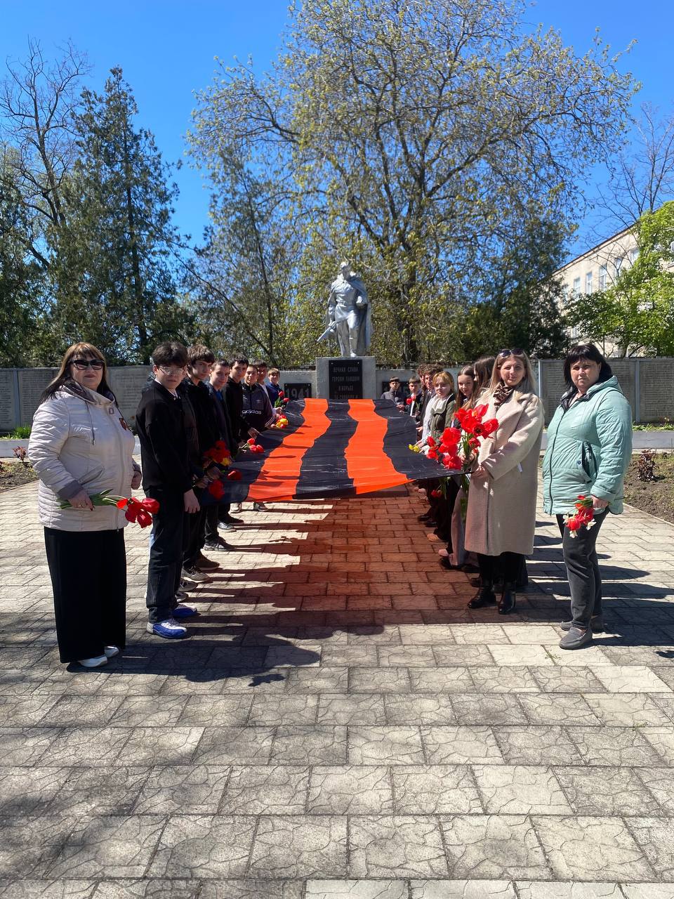 Школьники из Ближнего Хутора развернули большую георгиевскую ленту на сельском мемориале. Так они почтили память советских воинов, освободивших село от фашизма.