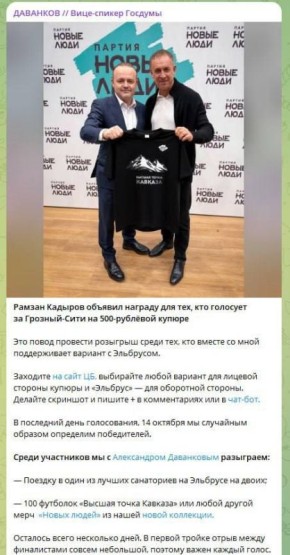 Депутат от "Новых людей" пообещал подарить победителю поездку в санаторий на Эльбрусе за голос в пользу горы.Голосование о новом дизайне купюры проходит на сайте ЦБ. Основная баталия развернулась за дизайн 500 рублевой купюры между Грозный-сити и горой...