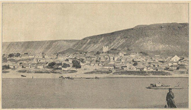 Фото конца XIX века.На фото видны здания костёла Святого Каэтана и иудейская синагога. На вершине Красносй скалы различимы земляные валы древней крепости.Источник: Книга «Имя на камне: Погребально-монументальные...