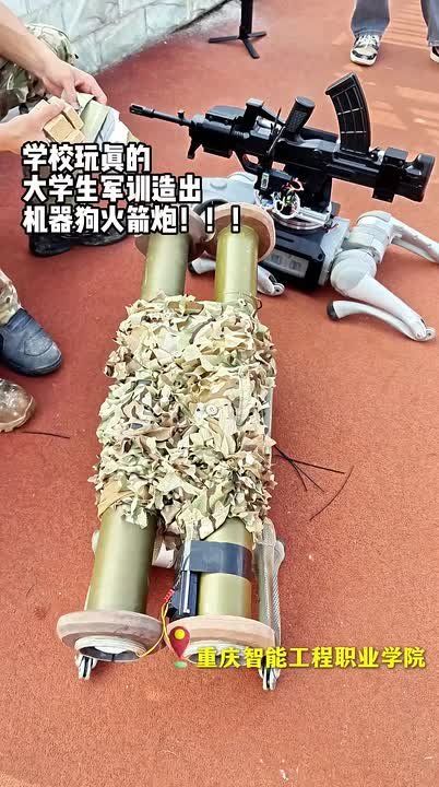 Это видео сняли во время учений в городе Чунцин. Они прошли на территории местного университета, студенты которого и разработали ракетную установку для робопса.